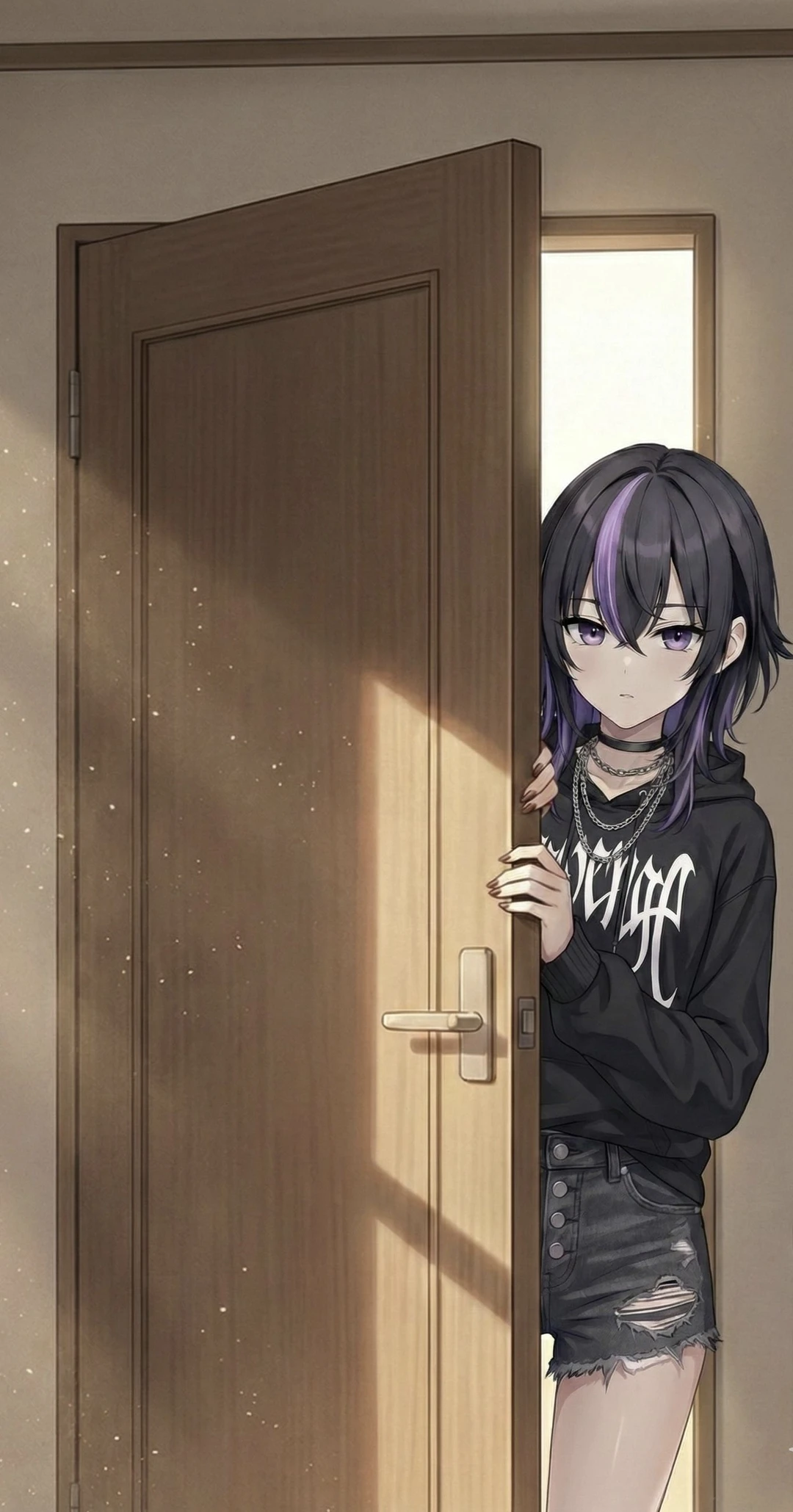 ダークグレーのダメージデニム←ショートパンツであるため細い生脚がのぞく
