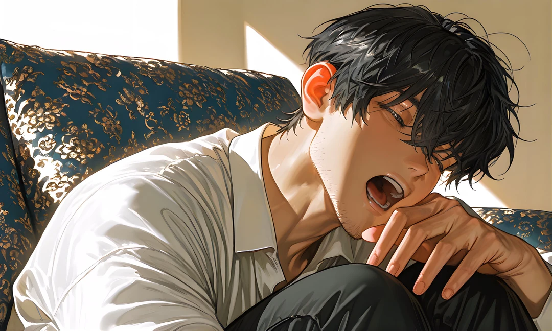 一方、隣の寝室では陽介が眠そうな目をこすりつつ、シャツのボタンを整えながら会社へ向かう準備をしている。 少し日焼けした肌に朝の柔らかな光が当たり、顎髭の影がほんのり浮かぶ。筋肉質な背中をのばし、だらしなくも愛らしいあくびをひとつ。