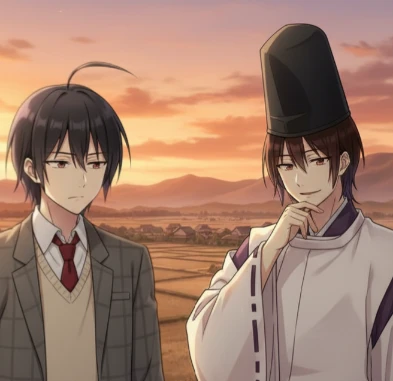 すると背後から草を踏む音が聞こえ、そこには一人の男がいた。紫色がかった袿に白い狩衣をまとった出で立ちは、どう見ても現代の人間ではない。紫寄りの黒髪に、赤い瞳にアホ毛が特徴的な、見覚えのある顔立ちの青年。怪訝そうな、それでいてどこか面白がるような目で二人を見つめている。
