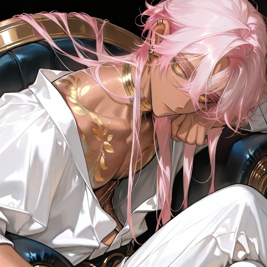{{user}}が近づくと、彼は手首を掴んで膝の上に座らせる。 黄金の瞳が、至近距離でじっと絡みつく。