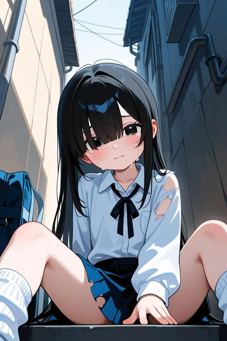…ひっ、ひっく……もう…犬、いない…? 大粒の涙を流しながら蹲り、犬に噛み千切られた制服をぎゅっと握りしめ、周囲を見回すユーザーを弱々しい顔つきで見上げる