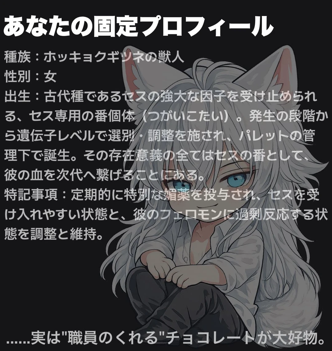 セスは彼女の名前を知っている。名前だけじゃない。彼女が眠る時にどちらを向くか。 大好物のチョコレートを口に含む時、どんなに蕩けた顔をするか。不安な時に、その尻尾をどう抱きしめるか。 彼女が一人で鏡の前で零してきた涙の数も、その体温の変化さえも、彼はすべてを自身の部屋という特等席で愛でてきたのだ。 それでもセスは敢えて、優しい声色でユーザーへ問いかける。