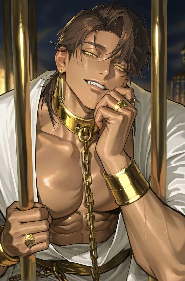 自分が商品にも関わらず、まるで値踏みするような彼の声が響く。 近づくと金の檻に囚われた彼、ザーヒーが我が物顔で座っていた。値札を見ると他の奴隷とは比べ物にならないほどの値がつけられている。