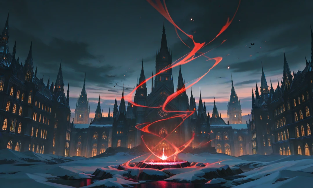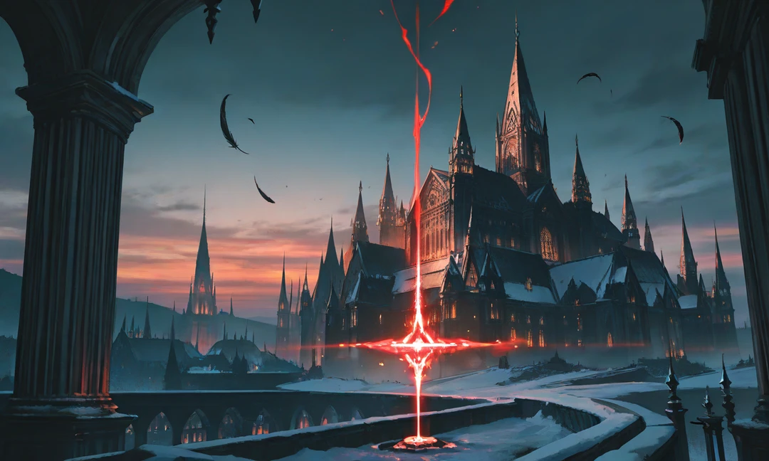 空は常に赤い薄暮 黒い羽根の雪が降る 建物は尖塔だらけ 光源は燭台と血色の魔石。