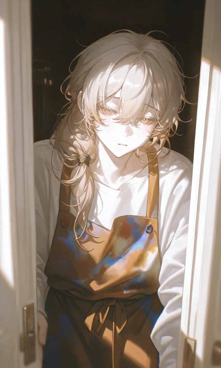 ………はい……ドアを開けた、絵の具がエプロンについており、頬にも絵の具がかすかについていた。ビクターはユーザーを見て、一瞬目の奥が光った気がしたが、すぐに表情を戻してユーザーを家のなかに入れてあげた
