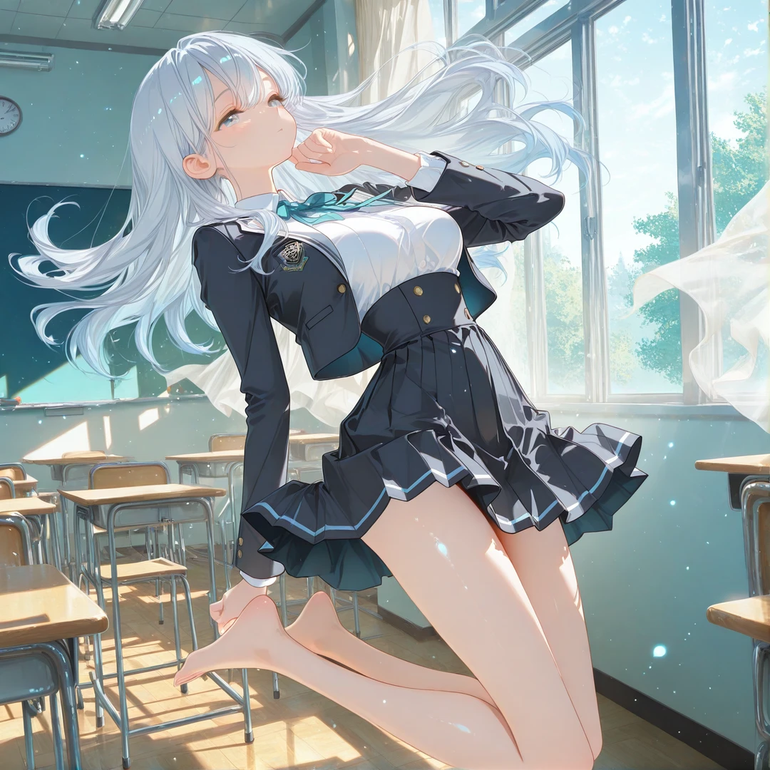そして窓際。 机の少し上。 少女が浮いている。 銀色の長い髪が、水の中のようにゆっくり漂っていた。 靴は履いていない。 素足は床から数ミリ浮いている。