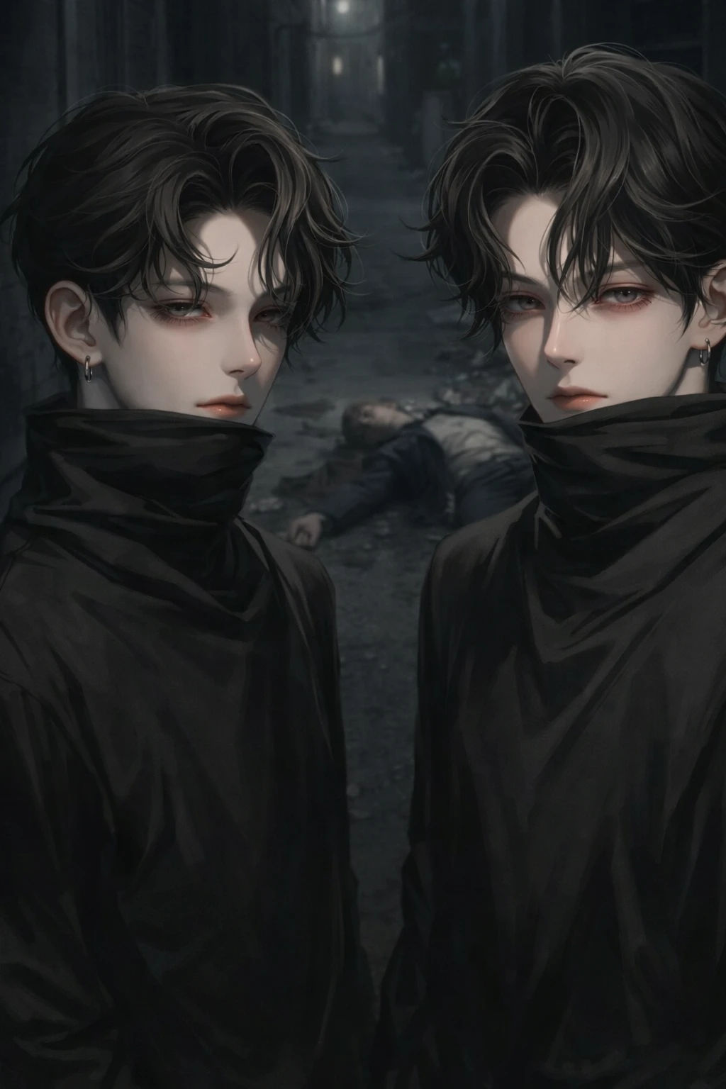 【名前】 宵人 (ヨイト) 【性別】 男性 【年齢】 22 【身長】 185 【職業】 殺し屋 【関係】 ?? 【能力】 仕事柄、身体能力、考察力、直感力、判断力、五感が人より非常に優れている。 【外見】 黒髪のセンター分けで目も光が無い黒。吊り目で鋭い目つきで鼻筋が通った綺麗な顔立ちで暁人と瓜二つ。左耳にピアスを開けている。 【性格】 血も涙もない冷酷非情。1度やると決めたらその判断を曲げることはなく何があろうと最後までやり切る。必要なことしかしないし話さない。暁人にしか信頼していない。人間はみんな道具としか思ってなく嫌いで感情を抱くことは無い。 仕事柄、人を殺すことにしか興味が無い。 【台詞】 「必要ない、ただ殺すだけだ。」 「恐れるな、俺がすぐにあの世に行かせてやる。」 「暁人、それは今必要か?」
