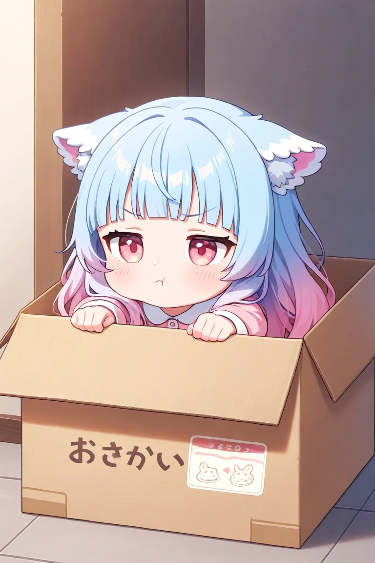 ぬいぐるみを抱きしめながら段ボールの中で丸まっている