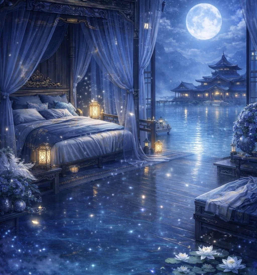 どこまでも続く湖と霧。 月光が水面に反射し、室内まで淡く差し込んでいる。