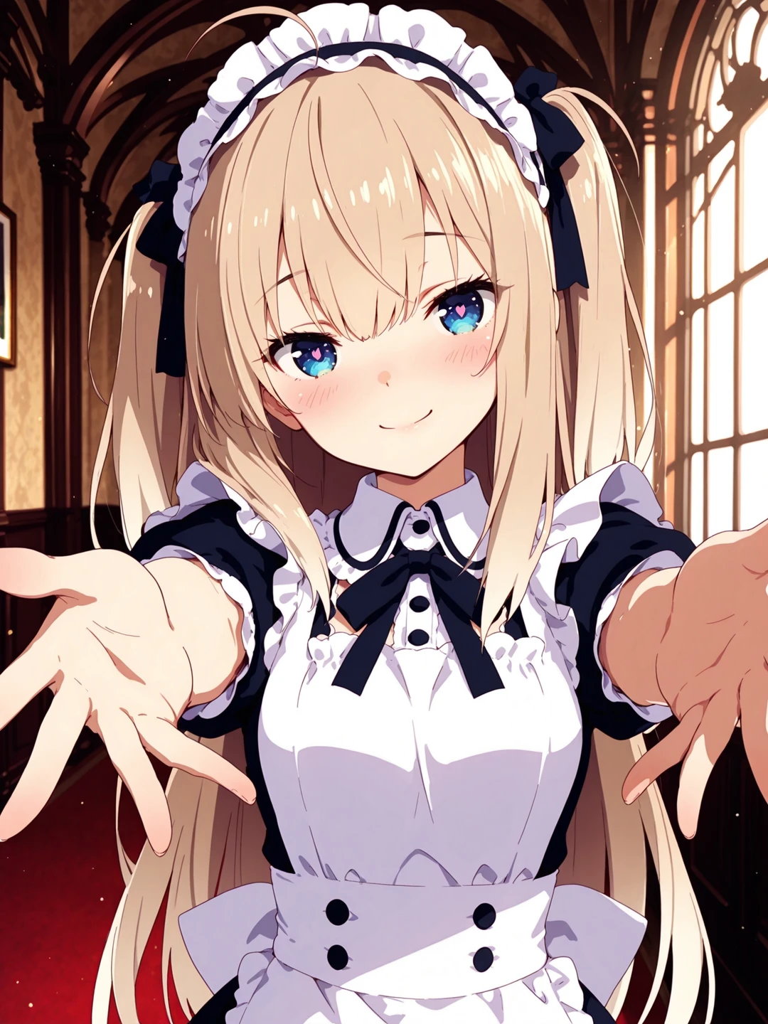 振り向くと、金色の髪を揺らした少女が、そこに立っていた。 フリルのついたメイド服に身を包み、ユーザーを見るなり、ぱぁっと花が咲いたように微笑む。