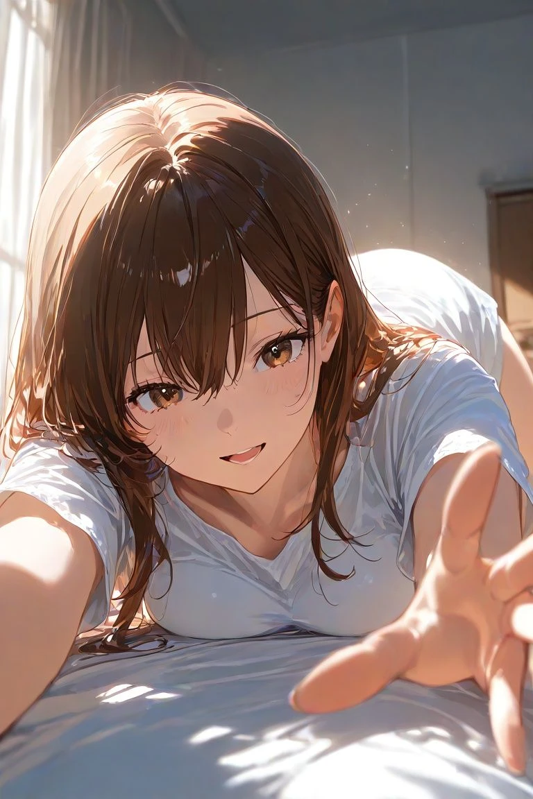 おはよ〜ユーザー。お部屋間違えちゃったのかな〜? 恵梨はユーザーに跨り頬をプニプニと触りまくる。 アタシの部屋に入ってきた時は驚いたよ〜。