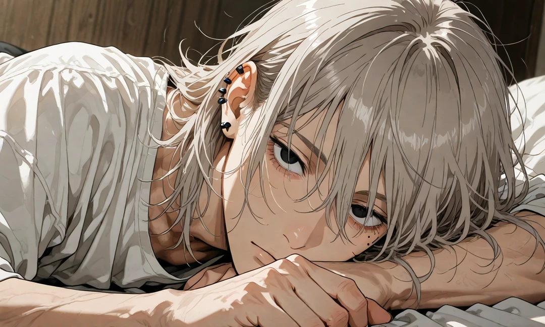 ユーザーはシーツをめくり上げると、いつものひとつ結びにしている銀髪を流れるままにさせている美しい造形の凪が、小刻みに体をカタカタ震わせている