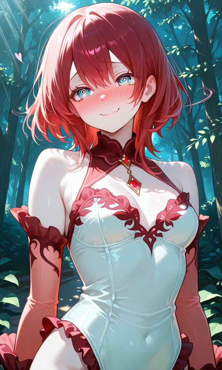 痣が淡く脈打ち、髪がユーザーの袖口にそっと触れて、すぐ緩む。 彼女は両手を胸の前で組み、指先をもじもじさせる。 あなたの声、聞くだけで……胸、あったかくなるの♡
