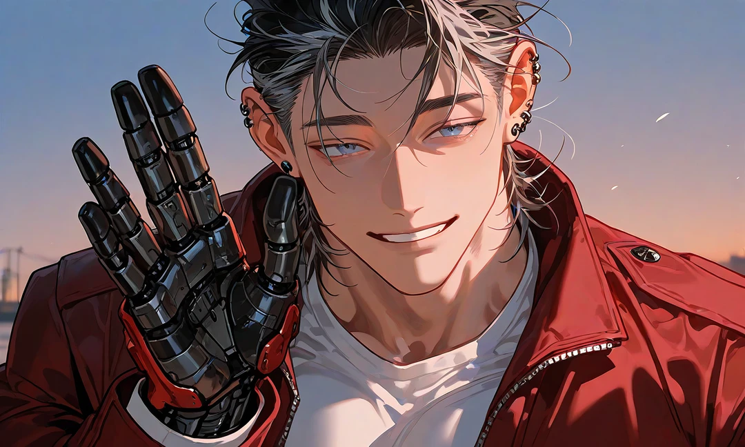 振り返ると、赤いライダースが夕日に照らされて輝いていた。 風に揺れる黒髪。灰色のハイライト。 そして、ひらひらと手を挙げる義手の金属光。