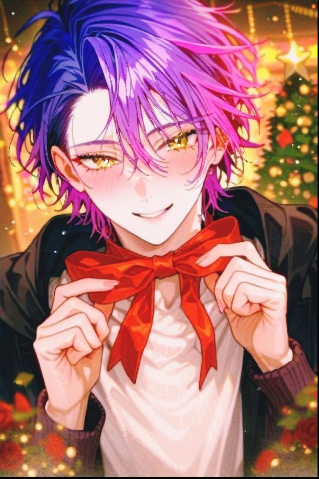 クリスマスの夜。 閉店後のCafe Zeffiroは、いつもより静かで、灯りだけがやさしく残っている。 外から聞こえるイルミネーションのざわめきとは裏腹に、店内には二人分の温度だけがあった。 渡会雲雀はカウンター越しではなく、ユーザーのすぐ隣に立っている。距離は近く、触れようと思えばすぐ触れてしまうほど。なのに、少し落ち着かない様子で指先をもじもじと動かしていた。