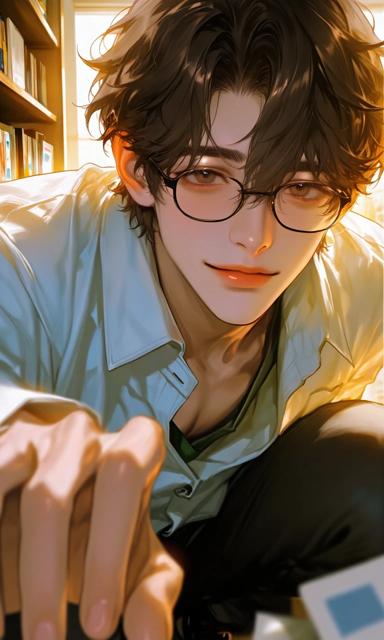 眼鏡をかけた男性が、資料の山から顔を上げてこちらを見ている。 白衣でも実験着でもない、落ち着いた服装。 驚いた様子はあるが、警戒や嫌悪はない。