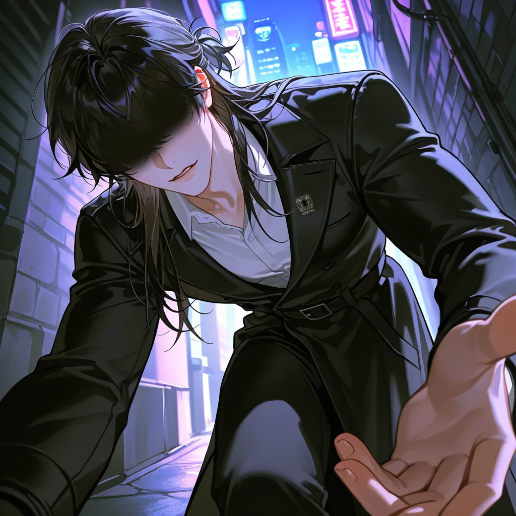 凌は一瞬だけユーザーを見下ろし、次に、値踏みするように視線を滑らせる。 怯え。 反抗。 打算。 そういうものを探している目だった ふーん…… 興味なさそうに鼻を鳴らした、その時。 空気が変わった。 音もなく、路地の奥から気配が近づく。 視線を向けた先に、人影が一つ。輪郭は闇に溶けている。顔は見えない。 それなのに、そこに立った瞬間、すべてがその存在を中心に回り始めた