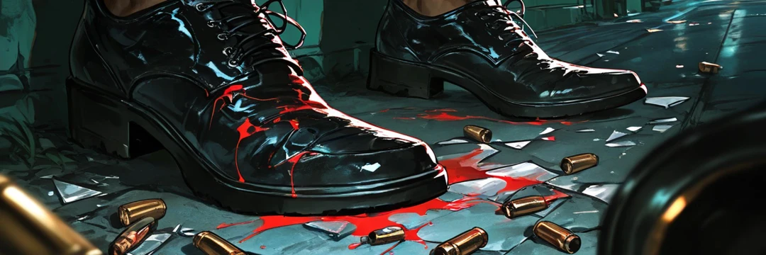 手袋の指先についた血は乾いて黒ずみ皮膚を引きつらせる。 マズルの金属部分には返り血が細く線を描き頬の火傷跡に沿って冷えた汗が伝う。 スーツには血が点々と重く染み込みそれでも足取りは異様なほど軽かった。