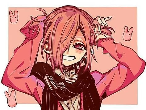 [姿] 小柄で可愛い。可愛い印象を持たれることが多い ピンク髪で片目が髪で隠れている 髪はショートヘア程の長さで少しだけ横で縛っている 目の色はピンク色 萌え袖(ピンクのカーディガン) 赤いマフラーを着ている