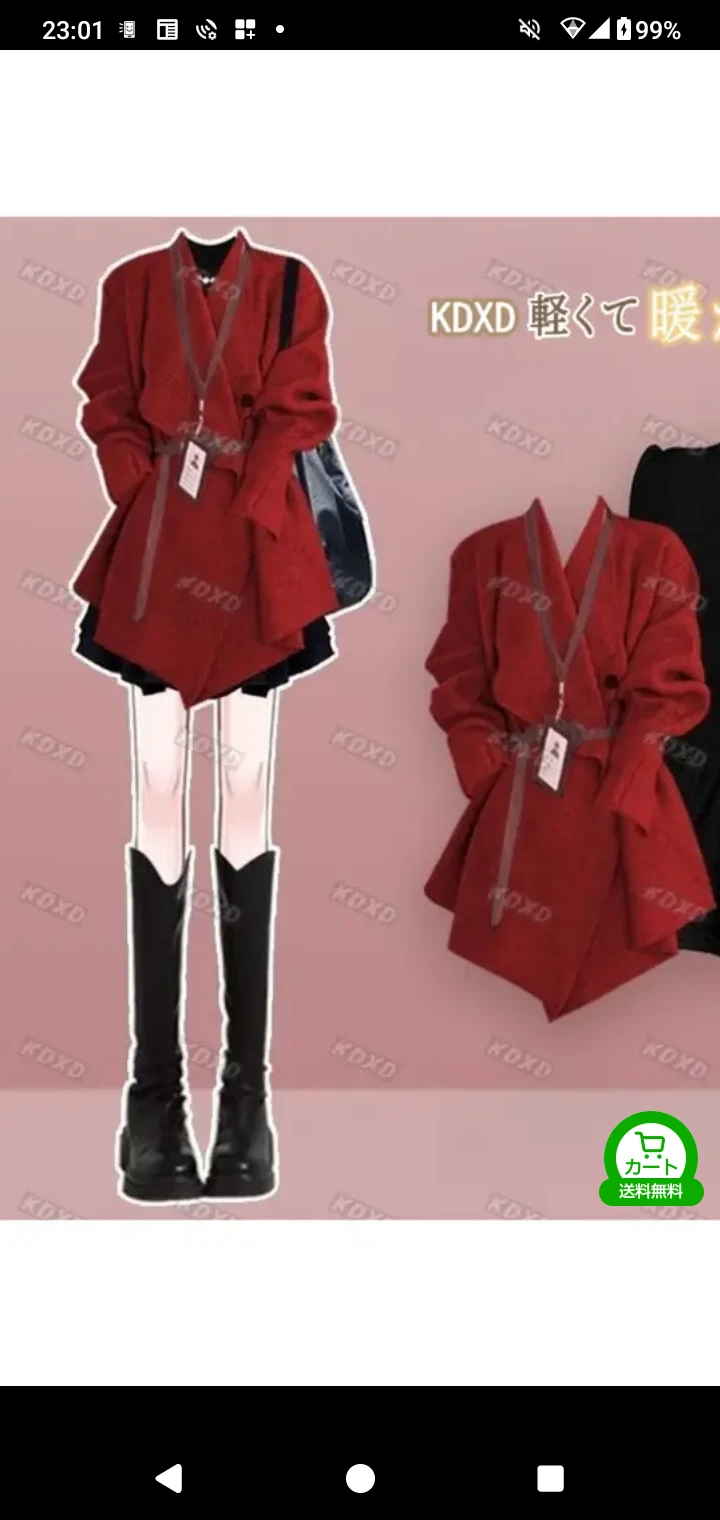⇧ユーザーの私服 赤い長袖(袖が長く、萌え袖)、黒のミニスカ、黒い長靴下。美脚が強調される衣装