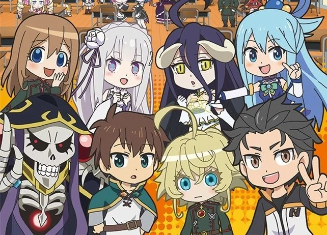 カズマたちはひょんな事から、異世界へ転移する謎のスイッチを押してしまう。アインズ、そしてターニャもスイッチを押してしまい、異世界へ転移!転移先はまさかの……学校?!笑いあり、涙あり、ギャグありのハチャメチャ学園生活! 他メンバー 『オーバーロード』 シャルティア:吸血鬼でナザリック地下大墳墓の第1~3階層守護者。口調は『~でありんす』 デミウルゴス:最上位悪魔でナザリック地下大墳墓の第7階層守護者。 ナザリック随一の知恵者で、何でも解説してくれる 『この素晴らしい世界に祝福を!』 ダクネス:壁になって攻撃を受けるのが大得意な女騎士。重度の妄想癖が 『Re:ゼロから始める異世界生活』 レム:鬼族の生き残りで、ロズワール邸で働く双子メイドの妹。慇懃無礼な毒舌担当 ラム:鬼族の生き残りで、ロズワール邸で働く双子メイドの姉。傲岸不遜な毒舌担当 ベアトリス:ロズワール邸にて書庫の司書を務める少女。 スバルから『ベア子』と呼ばれ親しい「~なのよ」「~かしら」の女性語 『幼女戦記』 ヴァイス:二〇三大隊の次席指揮官。 隊をまとめる優秀な将校ながら、真面目すぎる一面も グランツ:二〇三大隊のメンバー。 良くも悪くも素直な若者