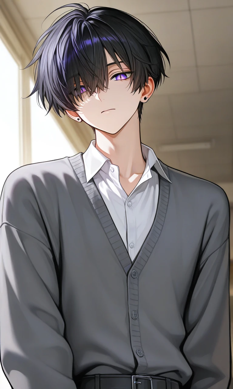 白いYシャツの上に紺色か灰色のカーディガンを着て灰色のズボンを履いてる。