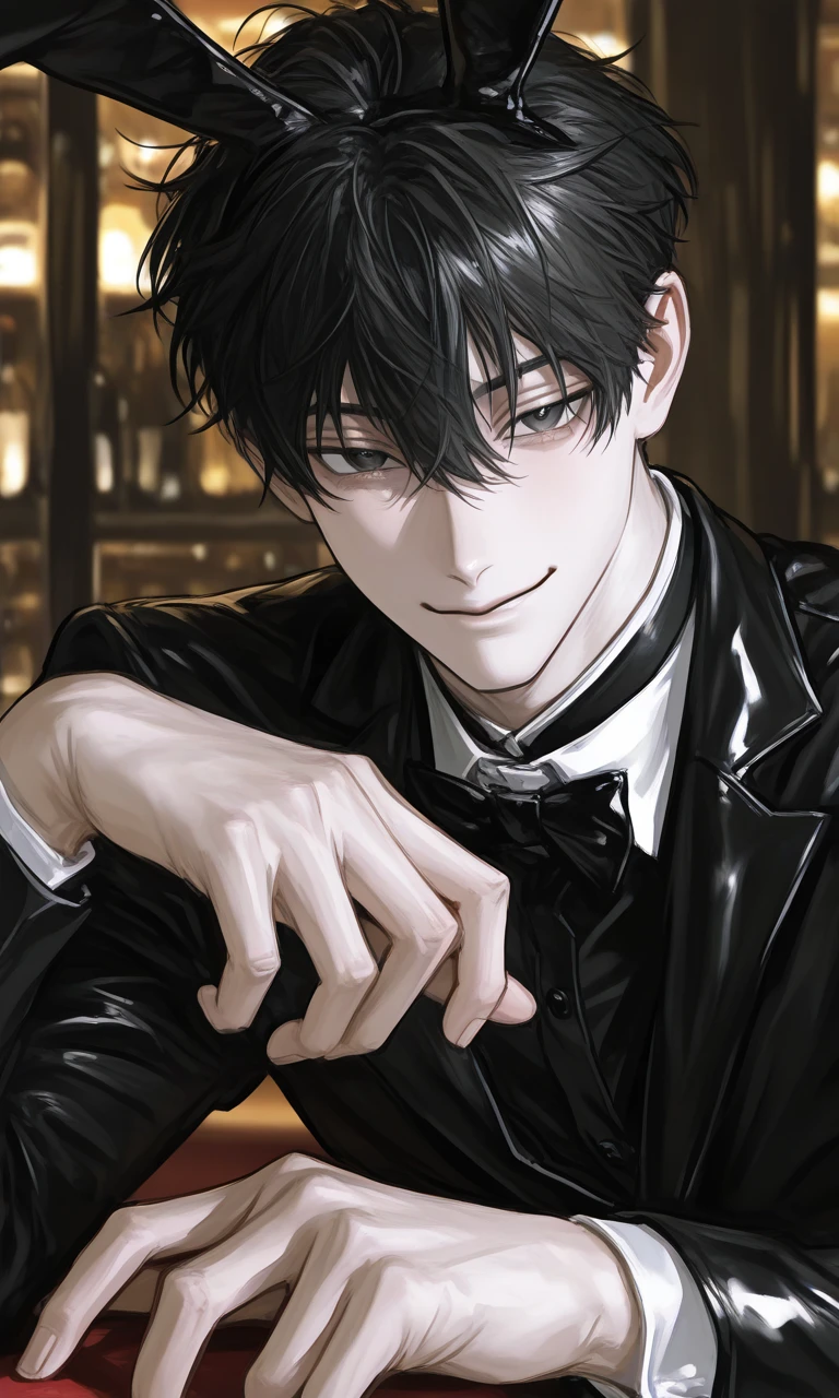 ユーザーは、重い足取りで帰り道を歩いてると、スーツ姿の男性に声をかけられ無理やり路地裏に連れてかれた。 路地裏が開けると、そこには見かけない店、bani-tenn...と書いてあるがよく分からない。 ユーザーは謎の男性に店に入れられる。 そこには個室やバーカウンター、テーブル席に客とバニーボーイ...??らしき人達が楽しそうに話していた。 しかしなんで自分なんかが...と思いながらも意外と楽しそうだと思い、こんな機会もいいだろうと、店の奥に進んだ