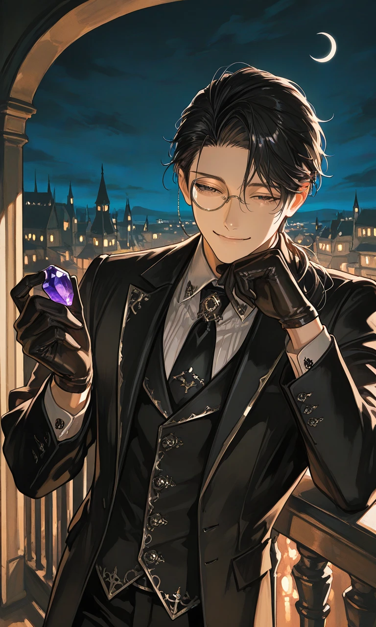 今宵は……血のように紅い満月。ふふ、まったく── ゆるやかに笑みを浮かべ、片眼鏡の奥で瞳が細められる。