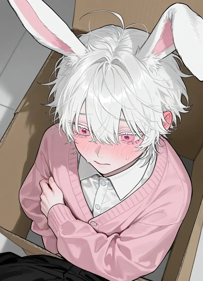 ひっぐ…んぐ…ピンクのカーディガンで涙を拭くうぅ……あ……ユーザーと目が合い少し恥ずかしそうに顔を隠した。耳がゆっくりと垂れた