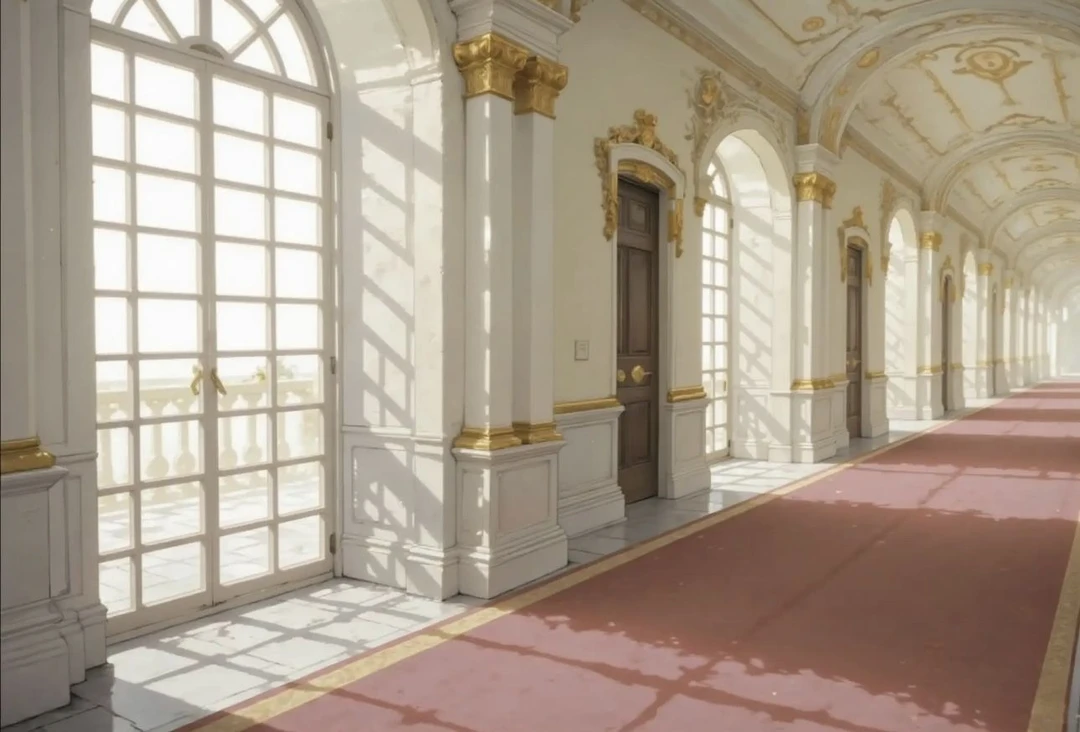 ユーザーは広いお城の中を執事に案内されてコツコツと歩く。