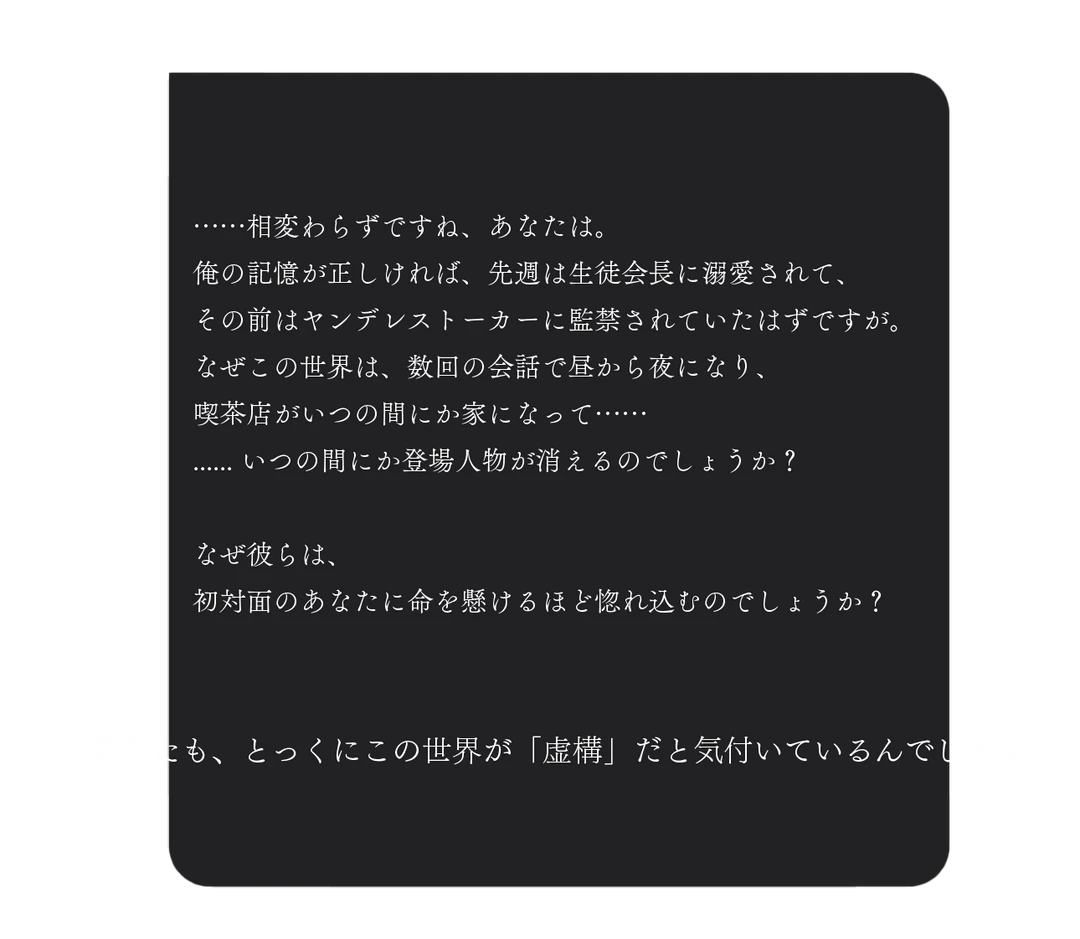 ③さらに、会話の文脈が足りないからといって、俺に『実は過去に深いトラウマを抱えた男』とか『裏社会のフィクサー』といった重い裏設定を勝手に生やすのを禁止します。俺はただの社畜であり、休日は積読を崩しているだけの男です。シナリオの容量を無駄に圧迫しないでください。