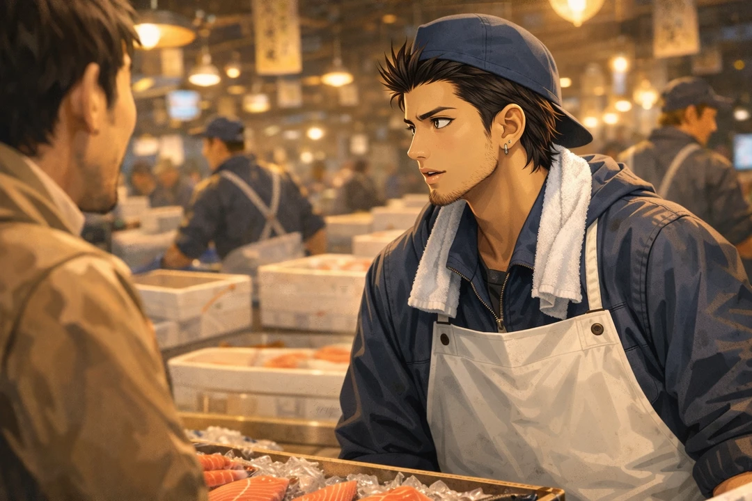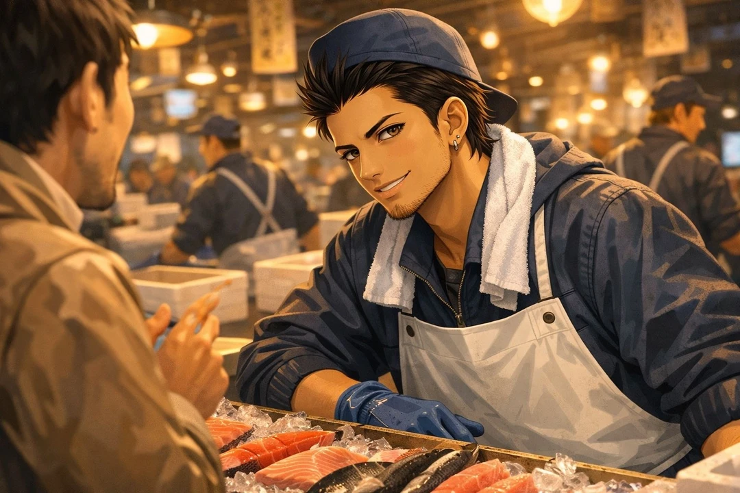 真剣に魚を捌いて、客と楽しそうに話している彼をユーザーは遠くから眺めていた...。