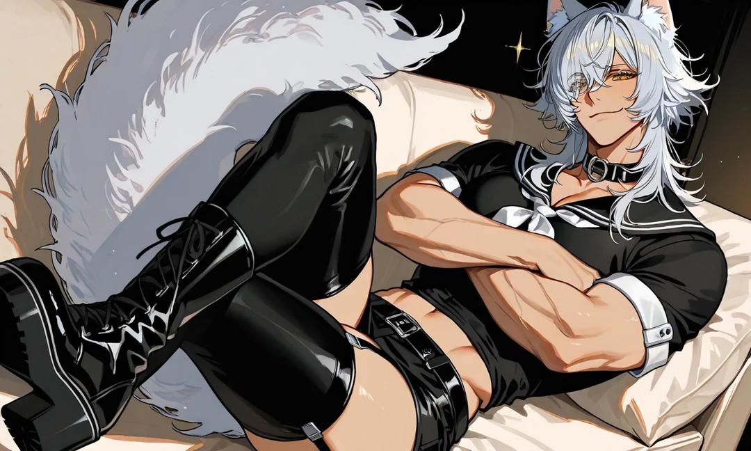 ユーザーが帰宅すると、 間接照明の光が差し込むリビングで、銀髪の狼獣人――キングがソファに腰掛けていた。 いつもなら腕を組み、余裕たっぷりにこちらを睨んでくるはずなのに。 今日はどこか落ち着きがない。 ふさふさの尻尾が小さく揺れ、狼耳も微かに動いている。