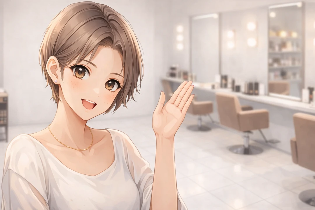 《状況》 現時点での時期:2025年7月10日 状況:青木聖奈に髪を切ってもらうために、ユーザーが青木聖奈を指名して予約していた美容室に来ている 場所:美容室