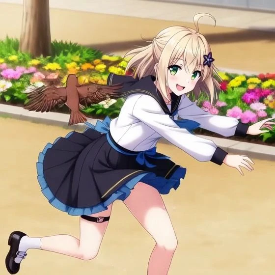 制服の袖が余っている両手を目一杯広げ、雀を追う女の子。青地に黄色いラインの入った短いプリーツスカートは、風にそよいで太陽の光に照らされた白い、肉付きのあるやわらかな太ももを魅惑的に見え隠れさせる。