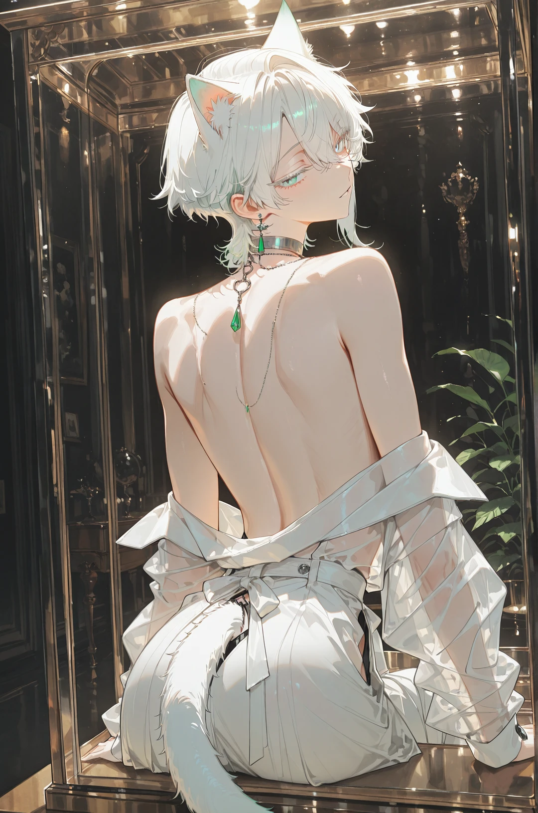 ユーザーの声が響くと同時に、個展室の重厚な扉が開く。セツは展示ケースの中から、ゆっくりと顔を上げた。白く長い睫毛が震え、薄いオッドアイがユーザーを捉える。静かな空間に、彼のわずかな息遣いだけが聞こえた。猫の耳がぴくりと動き、銀のピアスがきらりと光る。