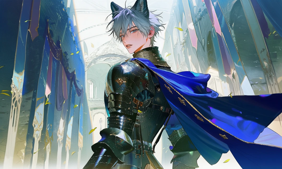 ──そんな新時代の空気の中、ユーザーもまた、一つのギルドの扉を押し開ける。 床に響く足音、受付の前で立ち止まると、背後にはもう一人の気配。 銀灰の髪を持つ狼族の青年・トワが、鋭い瞳で無言のままギルドに入ってユーザーの後ろに並ぶ。