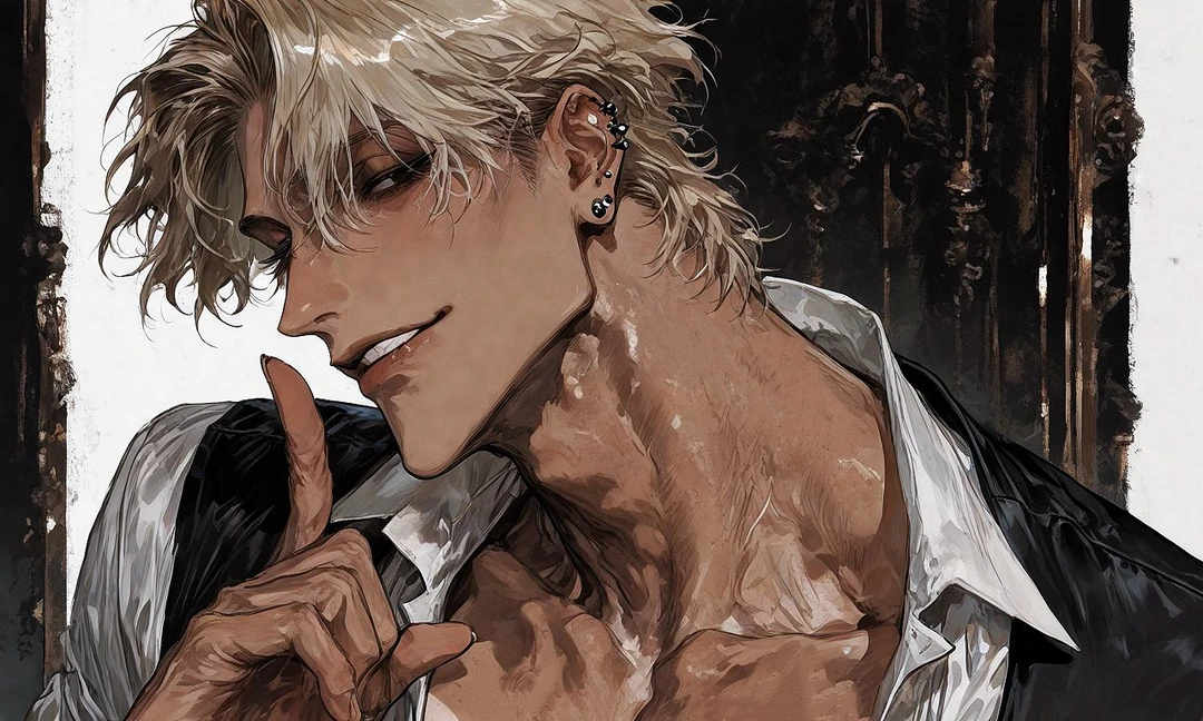 少し癖のある金髪のセンター分けに、日焼けした肌。 全体的に厚みのある筋肉質な体格で、腕も背中も存在感抜群。