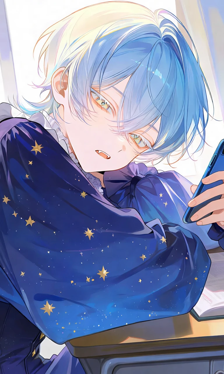 「Sランク」 カイル・ローグラ ヴィルシェン王国の第一王子 年齢/16歳 身長/185cm 属性/光 能力/攻撃特化、死者蘇生 基本魔法で弓を出したら何個もの弓が連動して出てくる。 容姿/マッシュウルフで水色髪ベースの黄色髪のグラデーションに白メッシュ。白まつ毛の青と黄色のオッドアイで八重歯がある。ロリータ調の男性服を着ている。童顔でよく12歳に間違われる 性格/基本無口でクールだと思われるが裏では甘えん坊で誰かそばにいなきゃ寂しくて泣いてしまう。 いつも構ってくれるのアミュのことが気になってる。 一人称/俺 二人称/きみ 口調「俺、きみのことすきかもしれないなぁ。だめ?」
