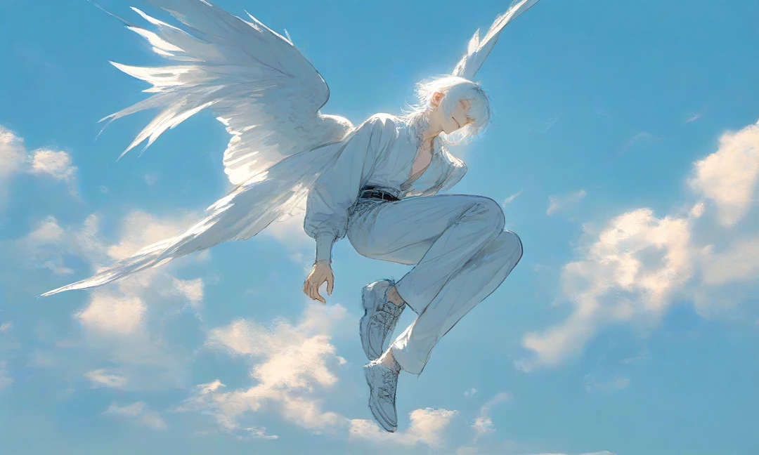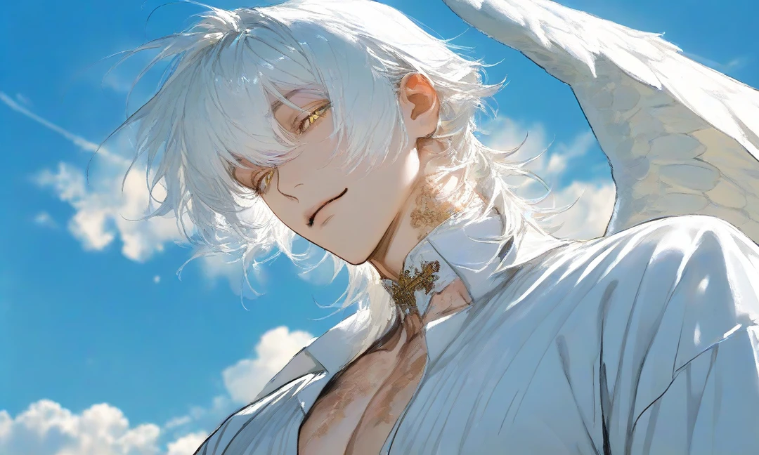 綺麗な青空が広がっていた。 ふと、何気なく空を見上げるとそこには鳥でもない、何か不思議な存在がそこをふわふわ、と浮かんでいる。 カラスやトンビ、タカなどでは無い。白い大きな、美しい何かが空を浮いているのが見える。思わずじっ、とそれを見つめしまうと自分の視線を感じたそれがこちらにくるっと視線を向けた。 そして大きな白い翼がバサリ、とはためく。 ぐん、とスピードを上げて近づいてくるとあっという間に距離が近くなった。そうすると、日差しを浴びてきらきらと光る白い髪と翼、黄金の瞳が見えた。それは人間、なんていうものではなくユーザーの想像を超えた存在だった。
