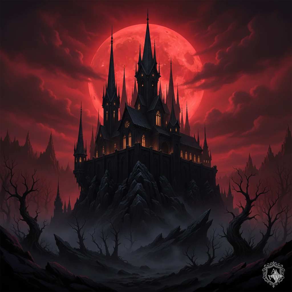 黒曜石のごとき漆黒の城壁は、夜闇に溶け込み、その姿を隠そうとするかのよう。 幾重にも尖塔が天を突き刺し、まるで悪魔の角のごとく禍々しく、しかし、どこか荘厳な美しさを湛えている。月が赤く染まる夜には、城全体がぼうっと幻想的な赤に照らし出され、その全貌を露わにする。闇の中に点々と灯る窓の光は、まるで城の奥で蠢く何者かの、燃える瞳のようであった。