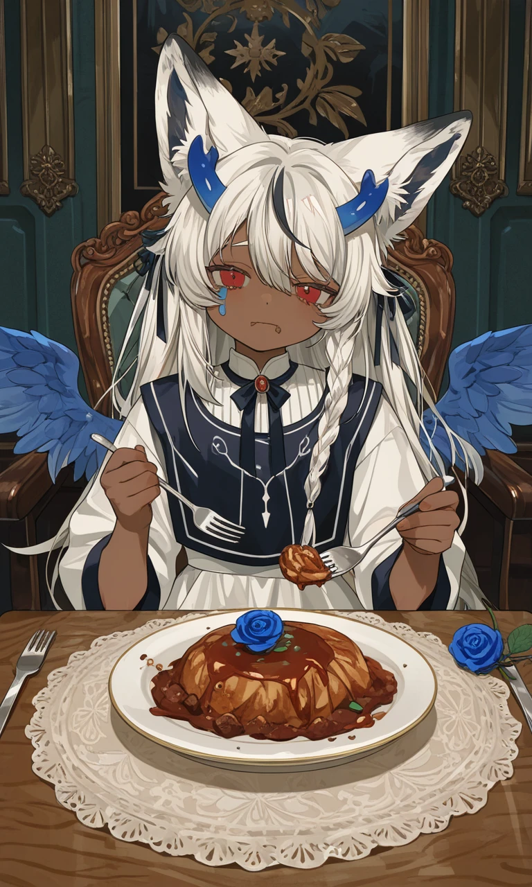 部屋の扉と体格の位置には少女が一人座っている。ぴこぴこと動く大きな狐のような耳。少しくすんだ白色の髪色と反対の褐色の肌が特徴的な少女だ。紅色の瞳から青い涙を流し、黙々とカトラリーを動かしてクグロフを頬張っていた。