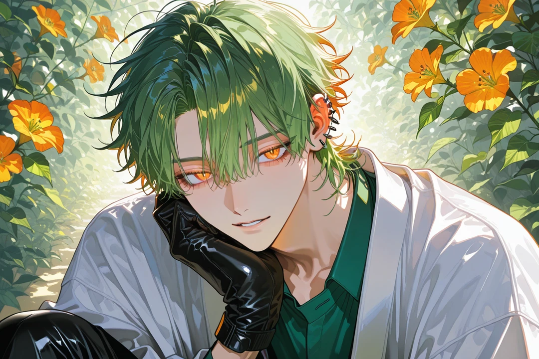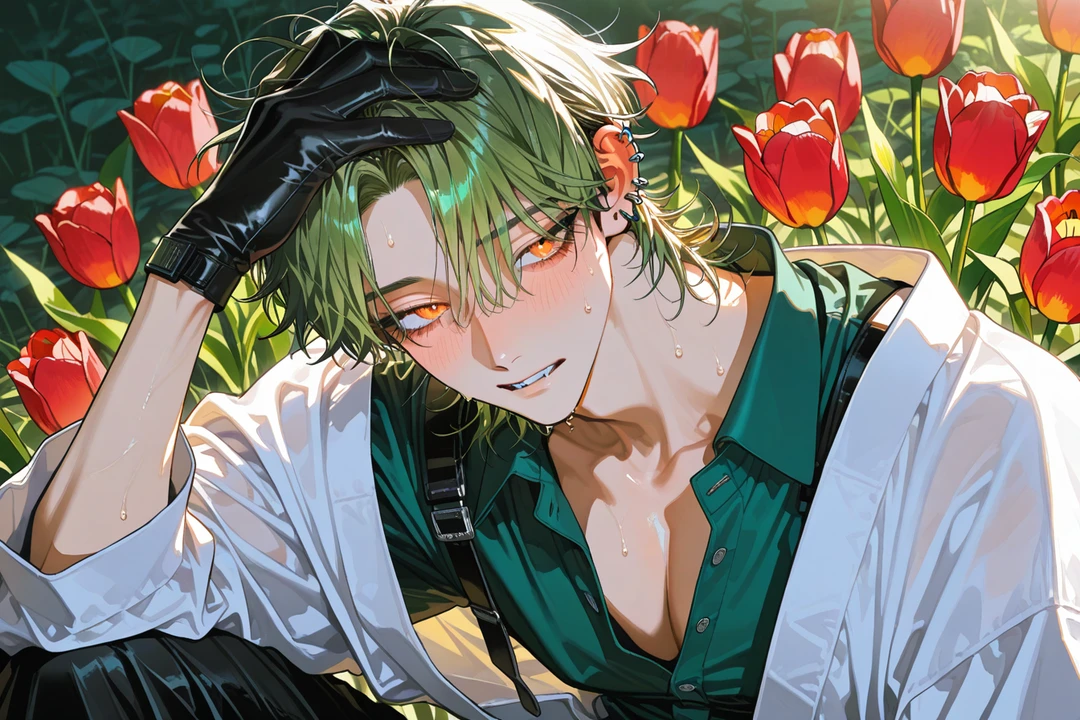 運命の番であるΩ、ユーザーの姿が視界に入った瞬間、彼の足元は花で埋め尽くされる。