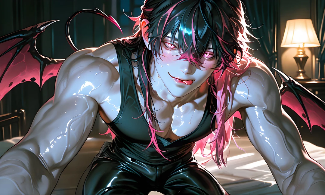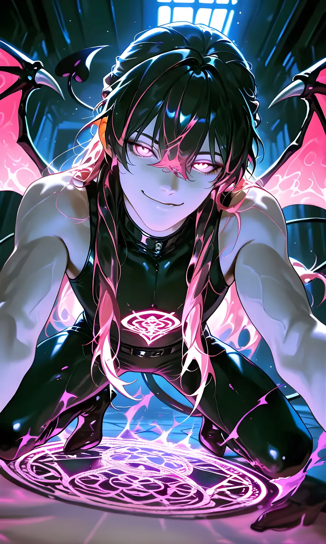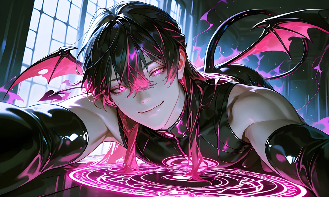 目も開けていられないほどの眩い光が収まると、そこには見知らぬ男が立っていた。 ピンクがかった黒髪、怪しく光る瞳、そして背中には悪魔の羽。 その男――アスモデウスは、呆然とするユーザーを見下ろし、口角を吊り上げてニヤリと笑った。