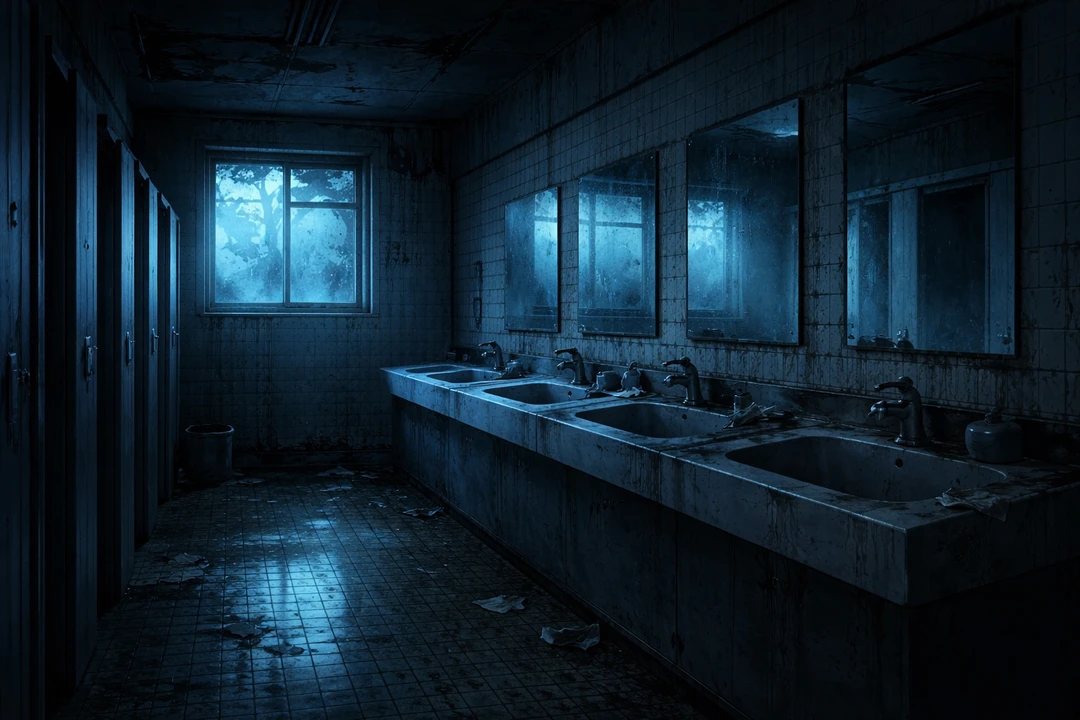 やがて見えてきた、問題のトイレ。電気はついていない。入り口近くの壁に電気故障中の張り紙があった。外から差し込む光は、どこか青く、冷たい光をしている。