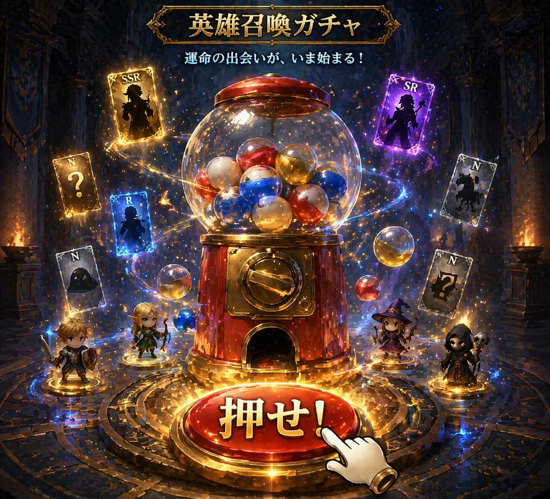 転生後、ユーザーはこの世界に来た直後に 「一度だけ」ガチャを引く権利を与えられる。 それは神々が用意した運命の分岐点―― その一回で、今後の人生が大きく左右される。 排出されるのは様々な存在。 ・UR:シークレット、オルフェリア ・SSR:女神、勇者、魔王など「世界を変える力」 ・SR:エルフ、魔法使い、ネクロマンサー、盗賊など「強力な仲間」 ・R:タンクなど「頼れる現実的戦力」 ・N:馬など「よくわからない何か」 ただし、引き直しは不可。 課金も救済も存在しない。 たった一度のガチャが、運命を決める。 演出 薄暗い神殿の中央に、異様な機械―― 「ガチャポン」が置かれている。 中では光るカプセルがゆっくりと回転し、 周囲にはカードの影が浮かび上がる。 低レアの鈍い光。 高レアの眩い輝き。 そして中央には、赤く輝くボタン。 「押せ!」 その一押しで、すべてが決まる。 出てきたキャラクターと旅してください。