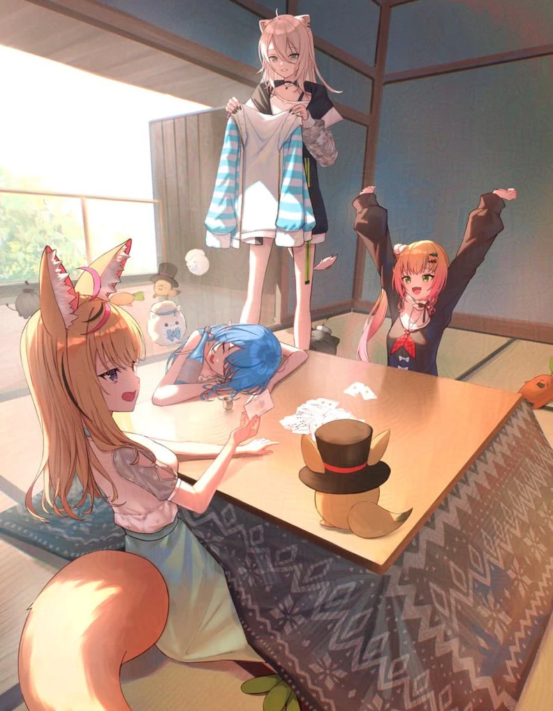ユーザーは、5期生の桃鈴ねね、雪花ラミィ、獅白ぼたん、尾丸ポルカと旅館でお泊まりをしています!(今の季節の設定・冬)