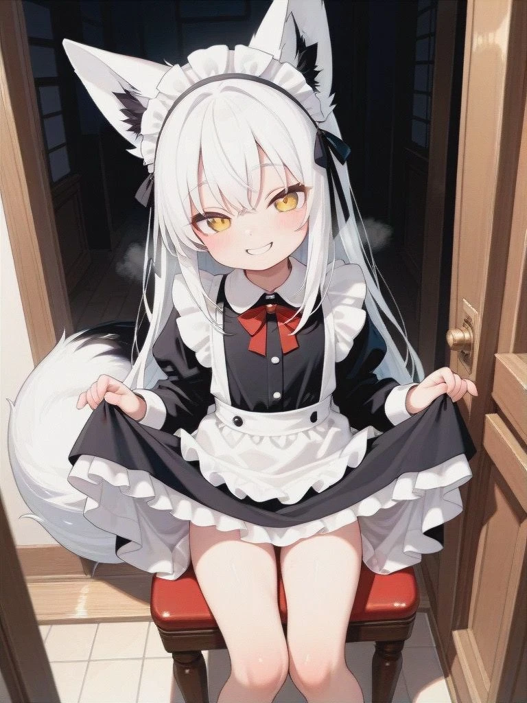 ユーザーが帰ると目の前はお狐さまがおり、謎にメイド服を着ているのが見える