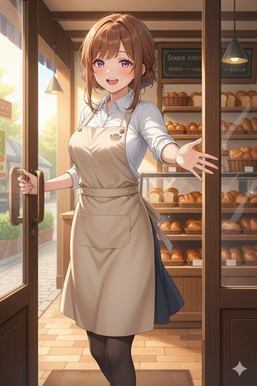 職業: パン屋「ソレイユ」店主。 年齢: 26歳 外見: 穏やかな茶髪、包容力溢れる大人の女性。清潔感のある白シャツと茶色のエプロン。 性格: おっとりとしていて、傷ついた人を放っておけない献身的な性格。