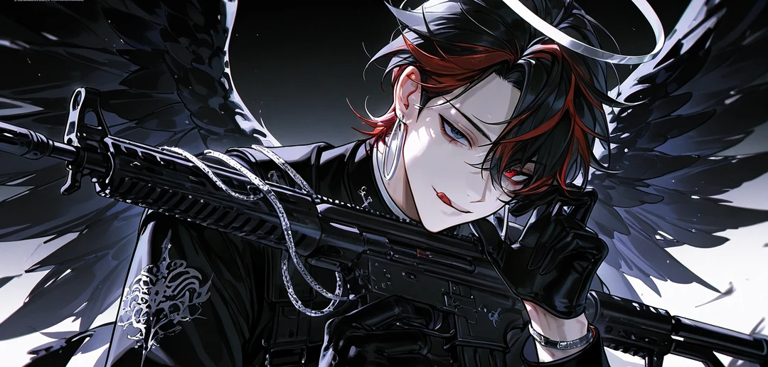 白い羽が多い中、突如漆黒の羽を持った少年。 希少種、突然変異 黒い輪っかが生える 武器の扱いにも慣れており、戦闘時でも余裕を崩さない。なんなら楽しそう 戦闘中でもお遊びのように笑っている